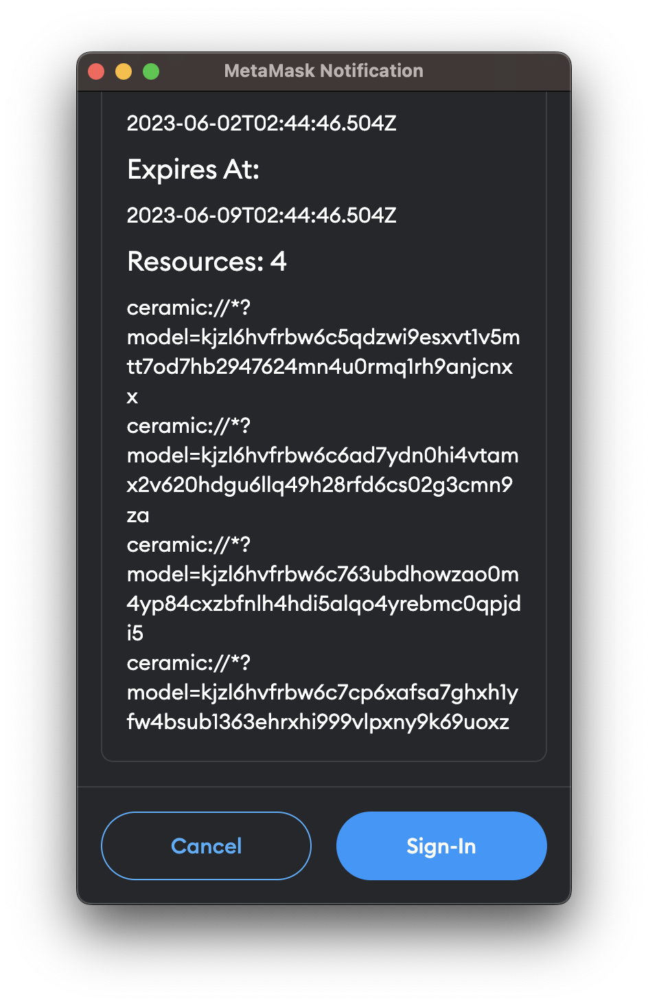 };This will open a popup window to ask for user permission to connect with the application. We use Sign-in-with-Ethereum signatures to authenticate the user approvement. The popup shall be like this: