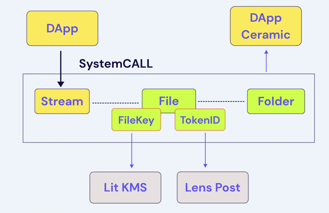 The encrypted file system is able to carry all files within DataverseOS over different applications by linking data streams on ceramic. Every time a data stream is created, DataverseOS will automatically create a corresponding file stream, bind the data stream to it and save it to the file system. Every byte of data is part of a file in DataverseOS. Users can manage their data via the file system.
