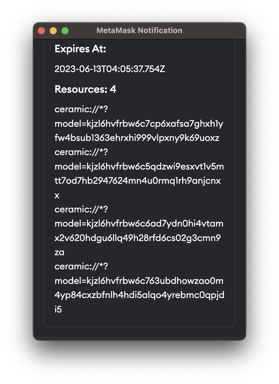 When an application is requesting access to a data resource, the user will be notified and asked for permission. Specifically, the application will request the user to sign a message and declare which data resources it is accessing within that message.